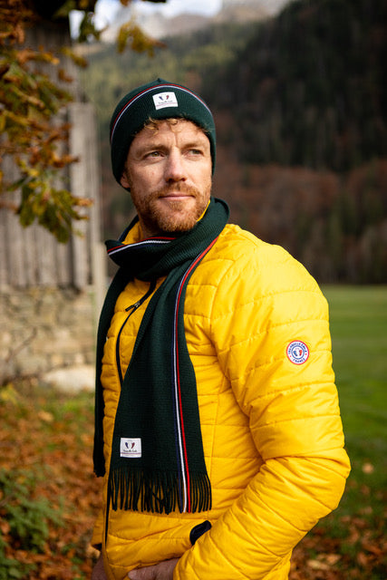 Notre bonnet vert forêt profond avec un fin liseré tricolore. Et parce qu’on ne change pas une équipe qui gagne, Le Givré vert forêt est toujours en 100% laine mérinos ultra-douce. Distinguez vous avec son liseré tricolore sur le revers.