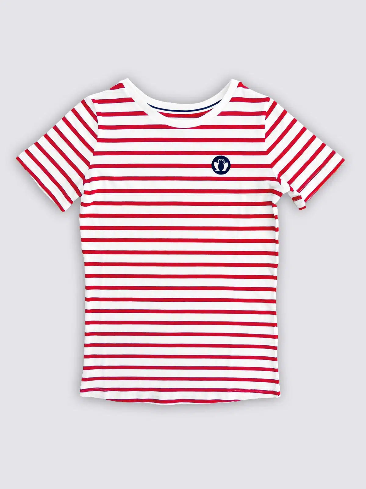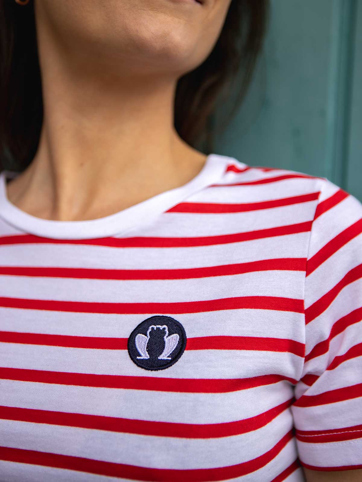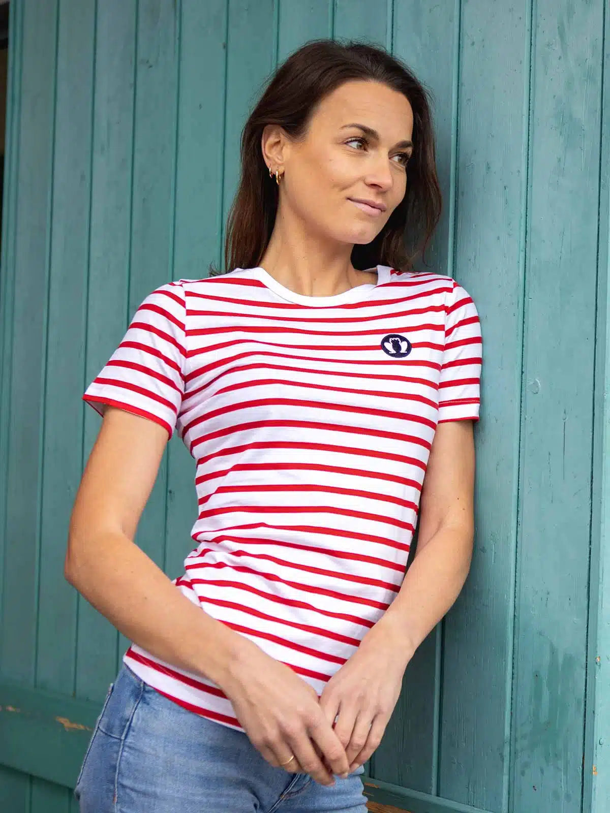 Il est temps de prendre le large avec notre nouvelle version de la marinière femme rayée blanc et rouge. Le Marin, t-shirt 100% coton avec un jersey premium de 170 g/m². Col rond évasé et coupe légèrement ajustée.