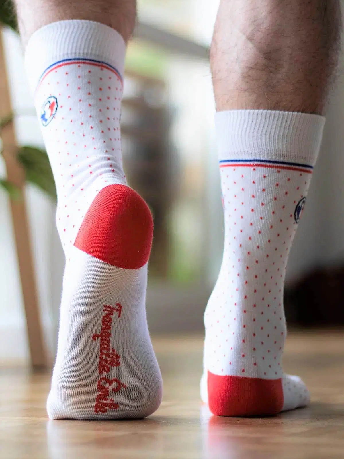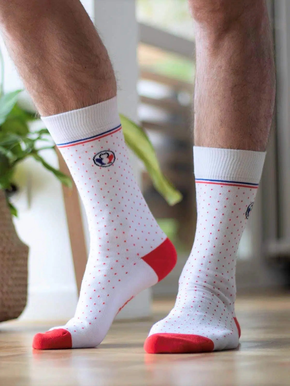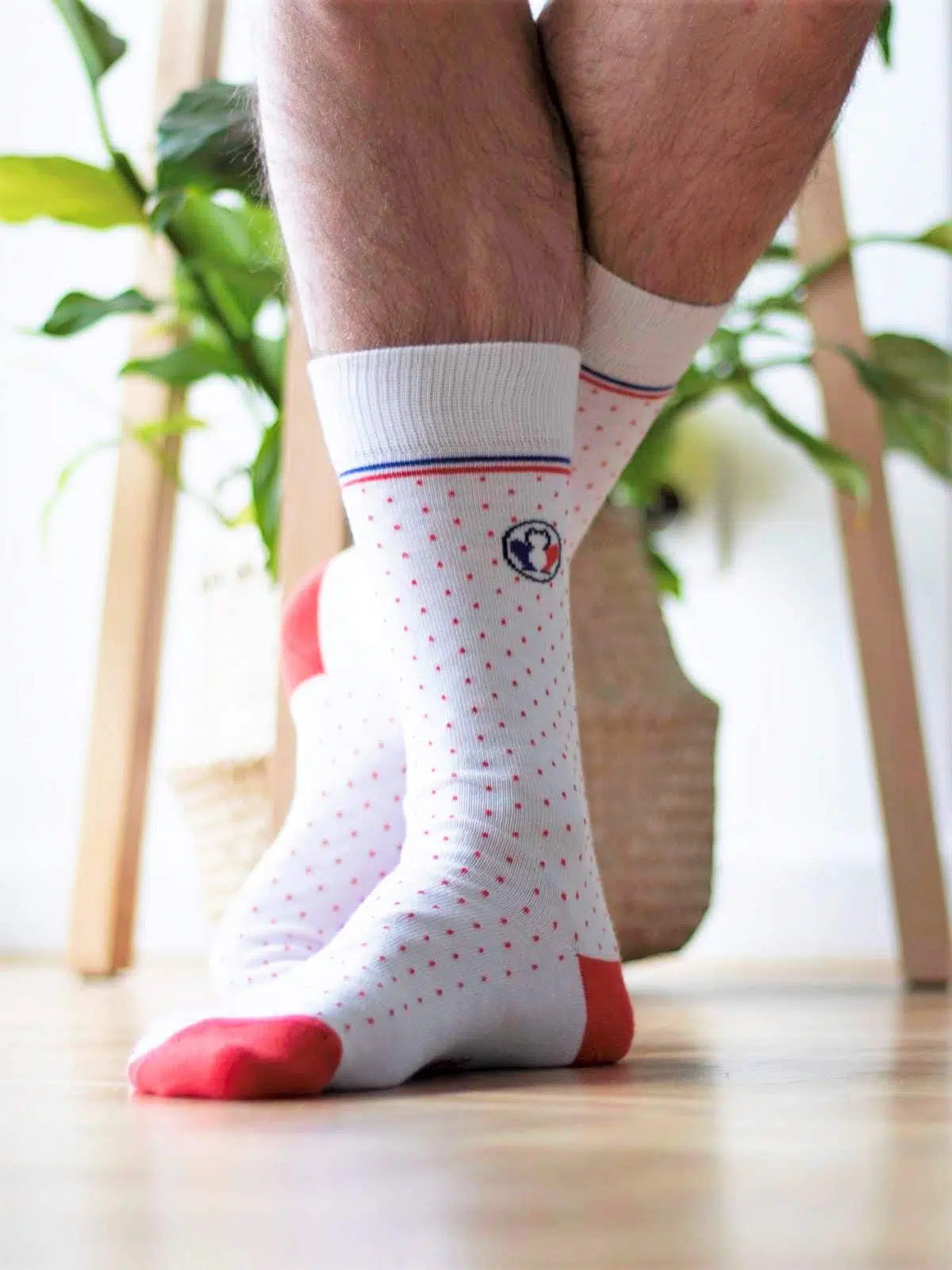 Le Pois revient en force ! Découvrez nos nouvelles chaussettes made in France blanches à pois rouges. Nos chaussettes sont tricotées à Limoges dans une entreprise labellisée « Origine France Garantie » et « Entreprise du Patrimoine Vivant ».
