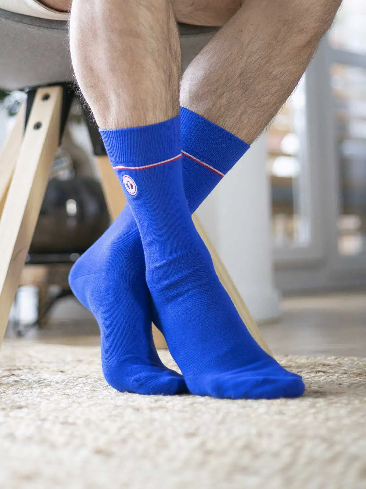 Mettez de la couleur aux chevilles avec Les Unies bleu électrique. Retrouvez la signature Tranquille Emile avec le fin liséré tricolore et notre grenouille brodée. Nos chaussettes made in France ont tricotées dans un atelier certifié « Origine France Garantie » et « Entreprise du Patrimoine Vivant ».