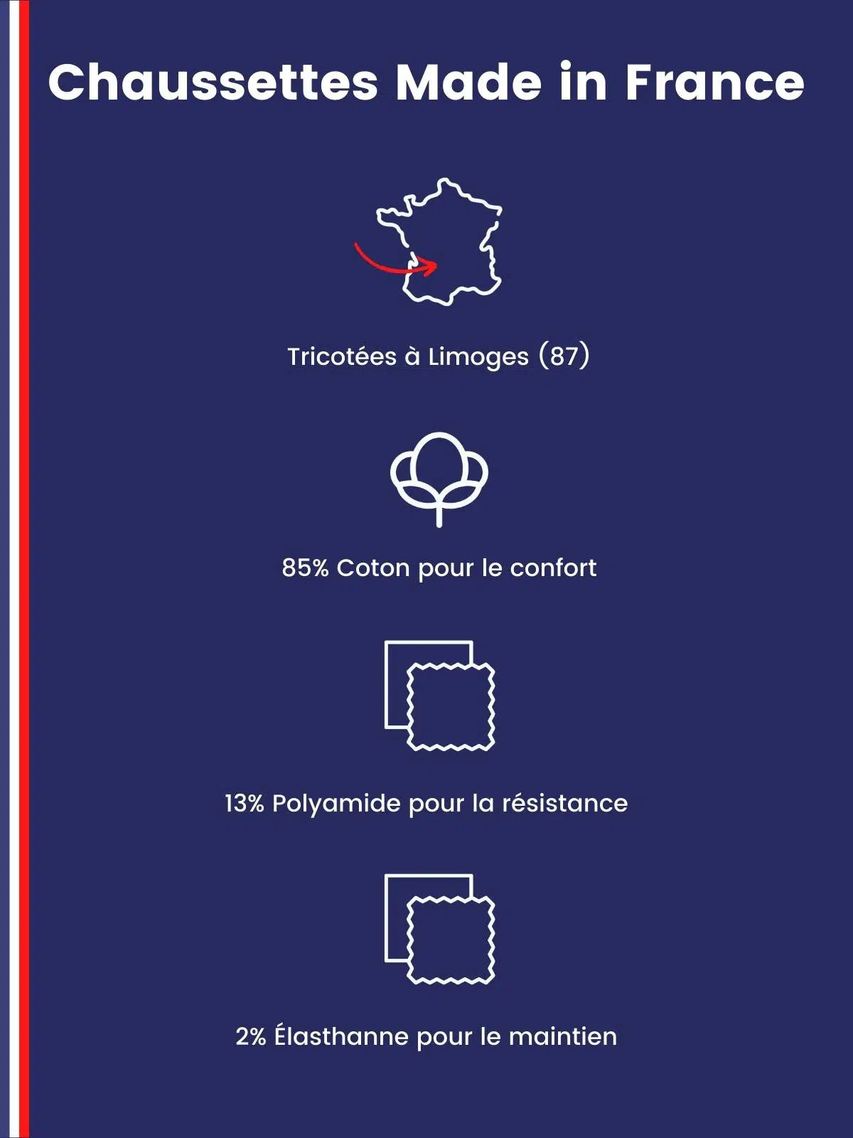 Pour tricoter nos chaussettes made in France, nous avons sélectionné 3 matières. Le coton pour un rendu noble et doux, le polyamide pour renforcer vos chaussettes et les rendre inusables, l’élasthanne pour vous garantir une excellente tenue peu importe votre pointure. Pour garantir la durabilité de votre paire, nous vous conseillons de les laver à l’envers et à 30°. Bannissez toute utilisation du sèche-linge et du fer à repasser qui ne feront que détériorer la douceur et le maintien de vos chaussettes.
