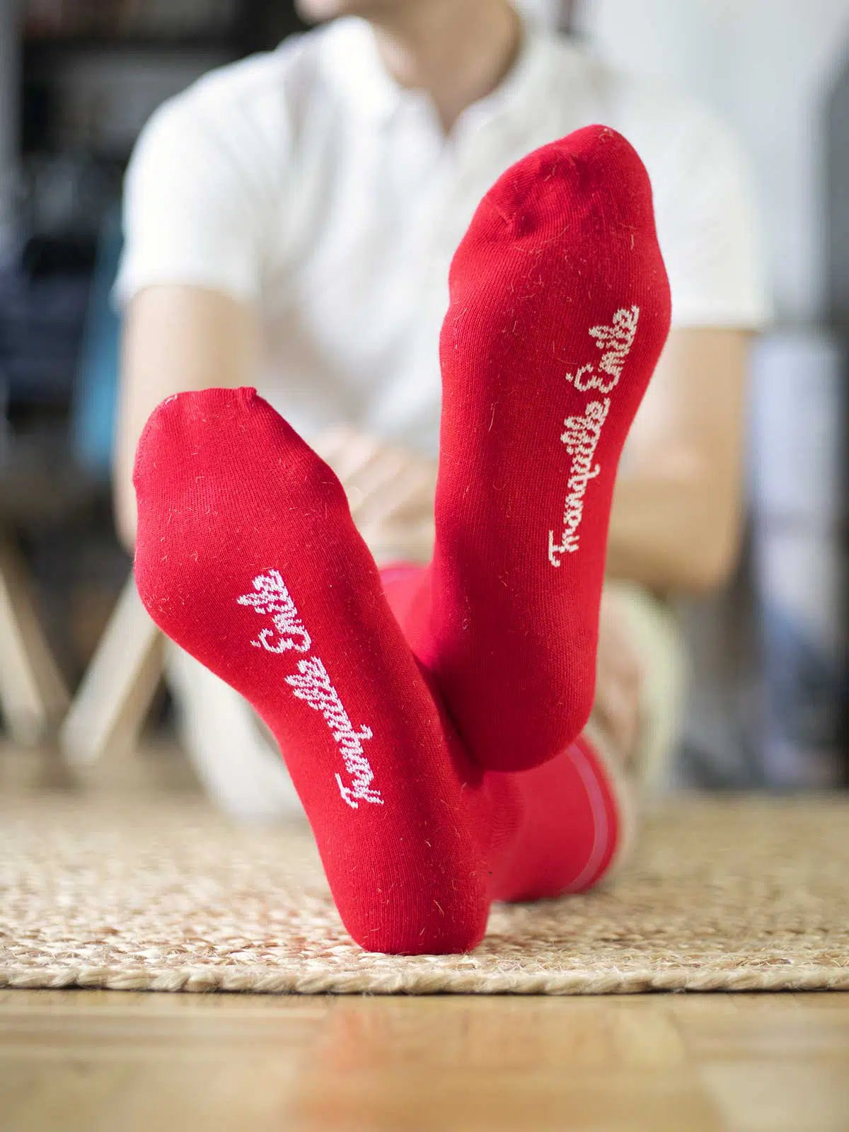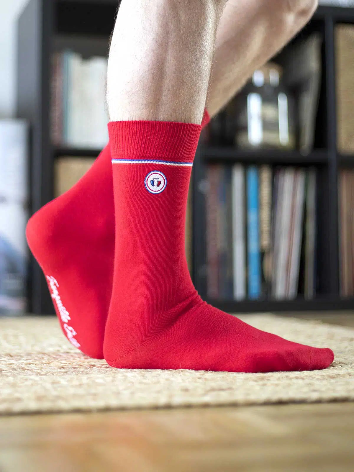 Mettez de la couleur aux chevilles avec Les Unies rouge vif. Retrouvez la signature Tranquille Emile avec le fin liséré tricolore et notre grenouille brodée. Nos chaussettes made in France sont tricotées dans un atelier certifié « Origine France Garantie » et « Entreprise du Patrimoine Vivant ».