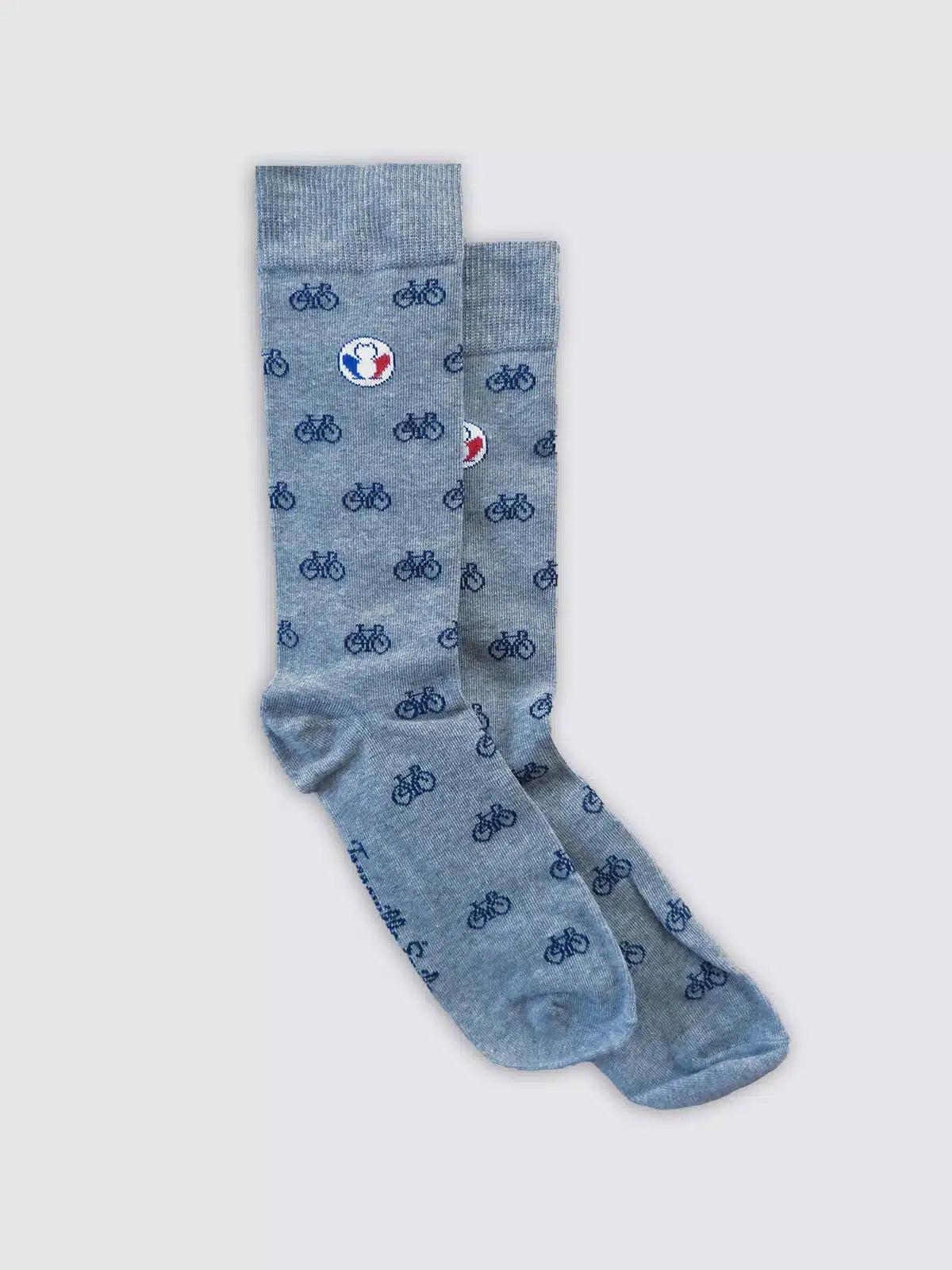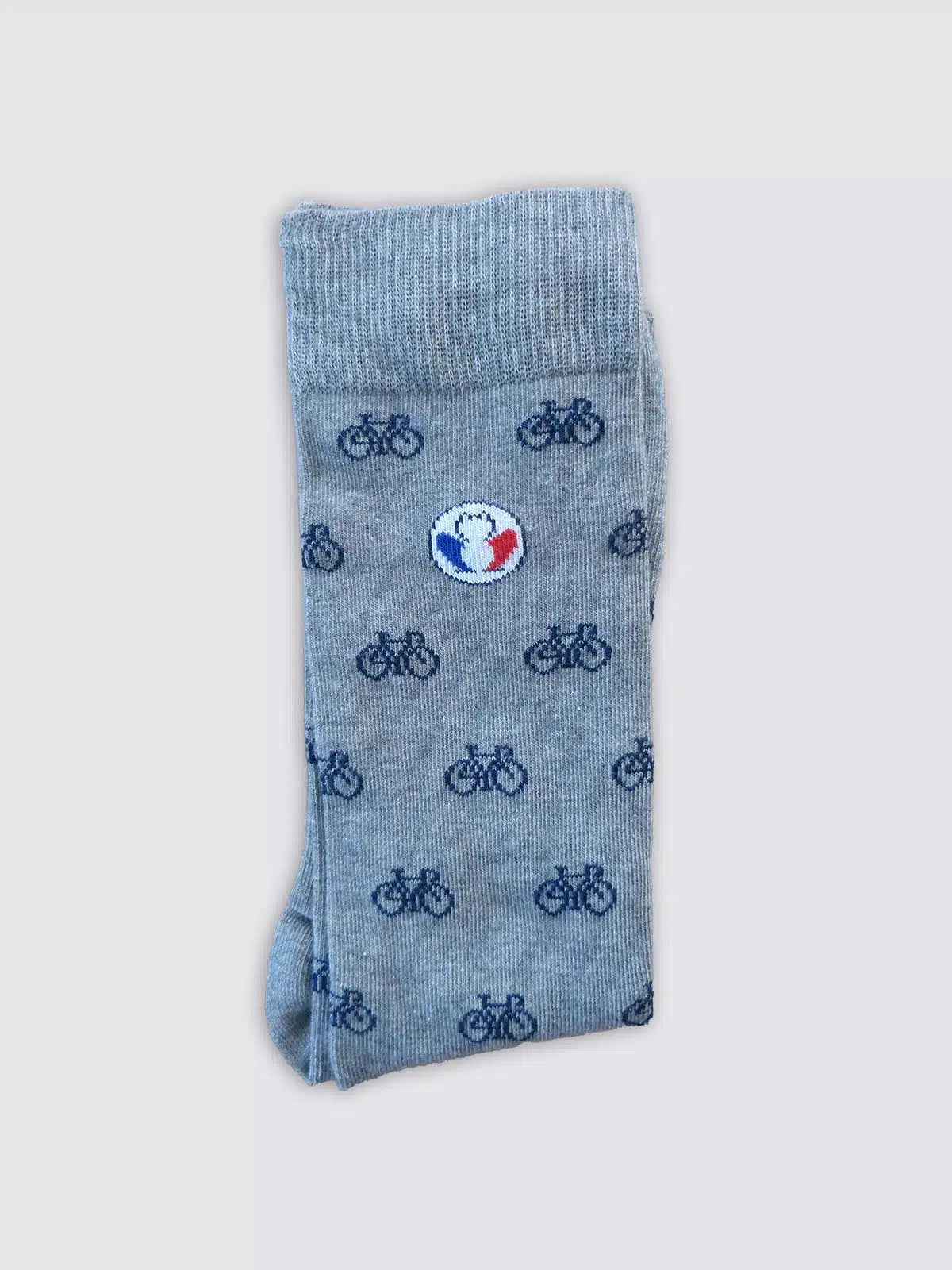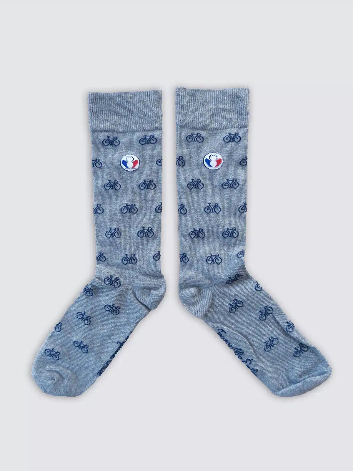 La paire de chaussettes incontournables grises avec des motifs vélos bleu marine. Nos chaussettes fabriquées en France sont tricotées à Limoges dans une entreprise labellisée « Origine France Garantie » et « Entreprise du Patrimoine Vivant ».